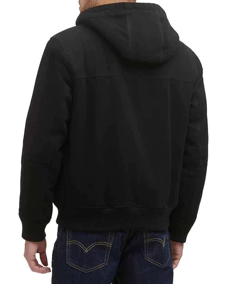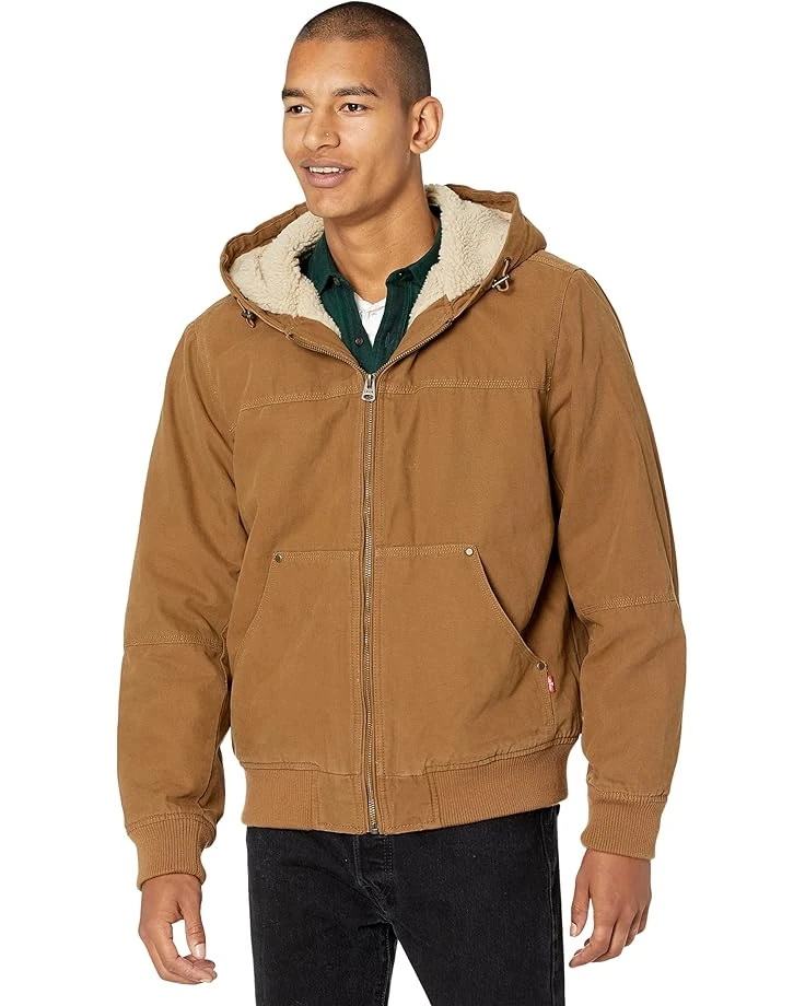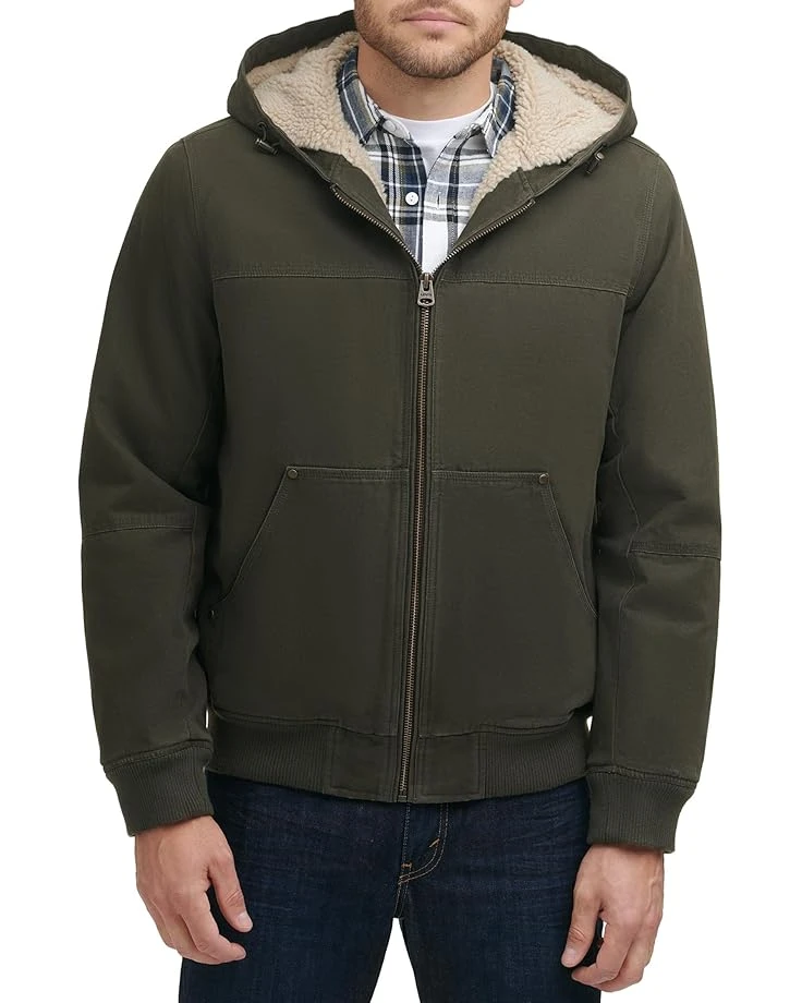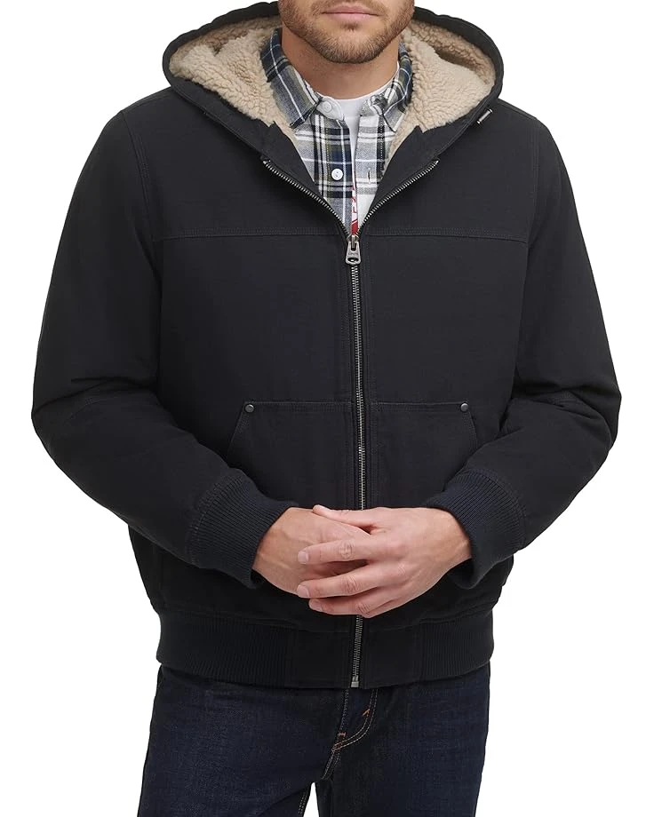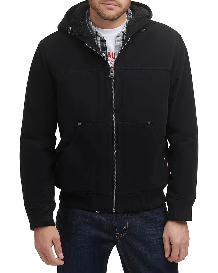 - Brave the elements in iconic style with the Levi’s® Cotton Canvas Hooded Utility Jacket with Sherpa Lining. Crafted for warmth, comfort, and style this jacket features a mock hooded collar with adjustable metal draw cords, center front zip closure, long sleeves with ribbed cuffs, front lower split kangaroo pocket, and a ribbed hemline.