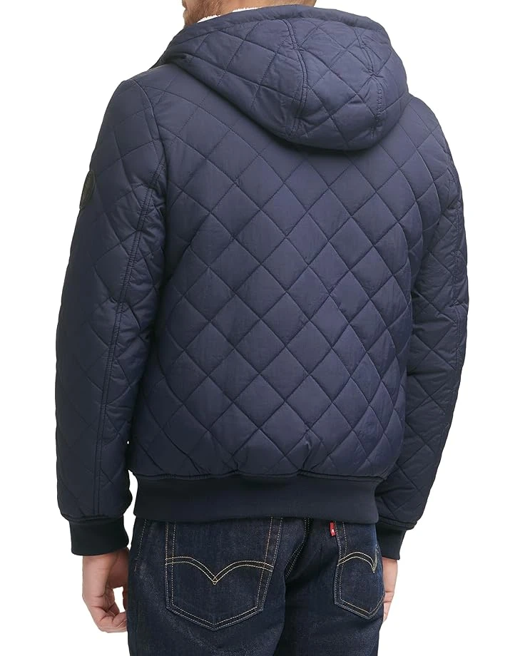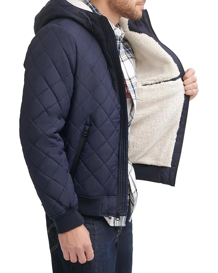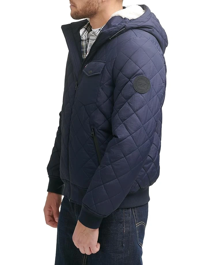 - Style in a different way by wearing Levi’s® Diamond Quilted Bomber with Sherpa Lined Hood. The diamond-quilted jacket has long sleeves with elasticated ribbed cuffs. An attached hood covers the head for added protection.